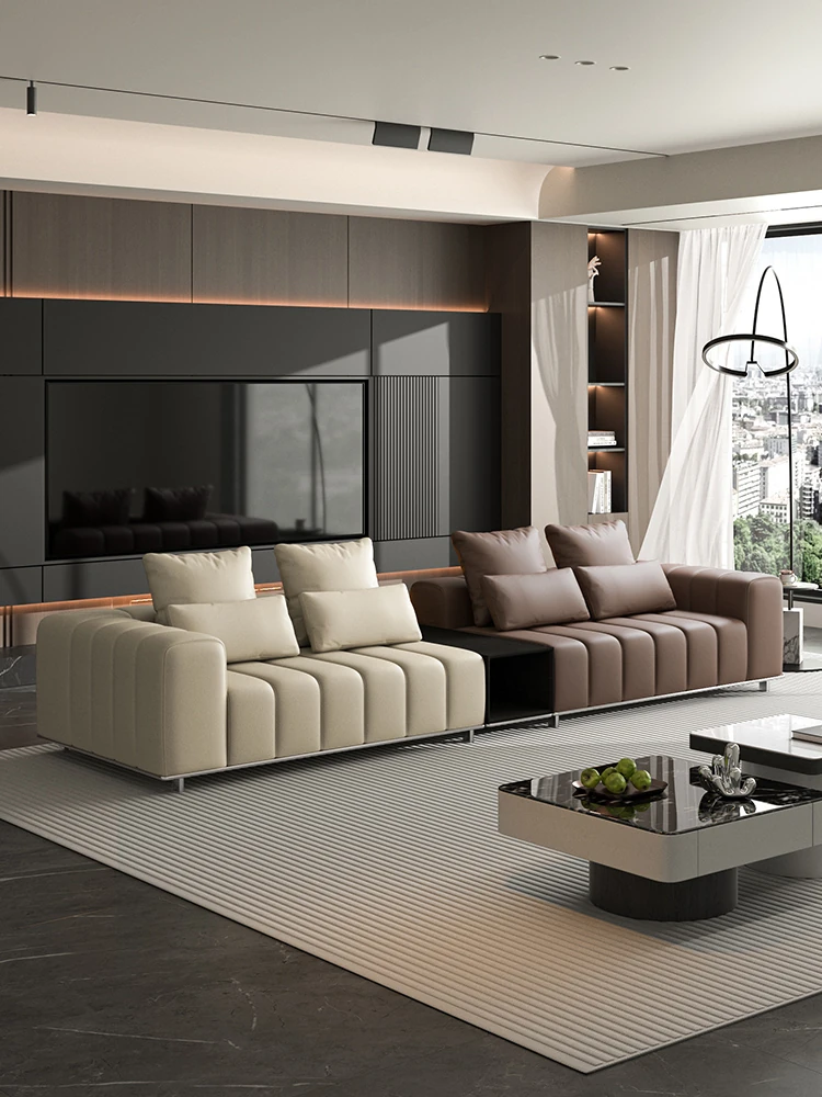 イタリアンミニマリズムの本革ブレザーソファ - 高級別荘に最適な一流の牛革製、デザイナーによる直線的なデザインで、洗練されたリビング空間を演出します。