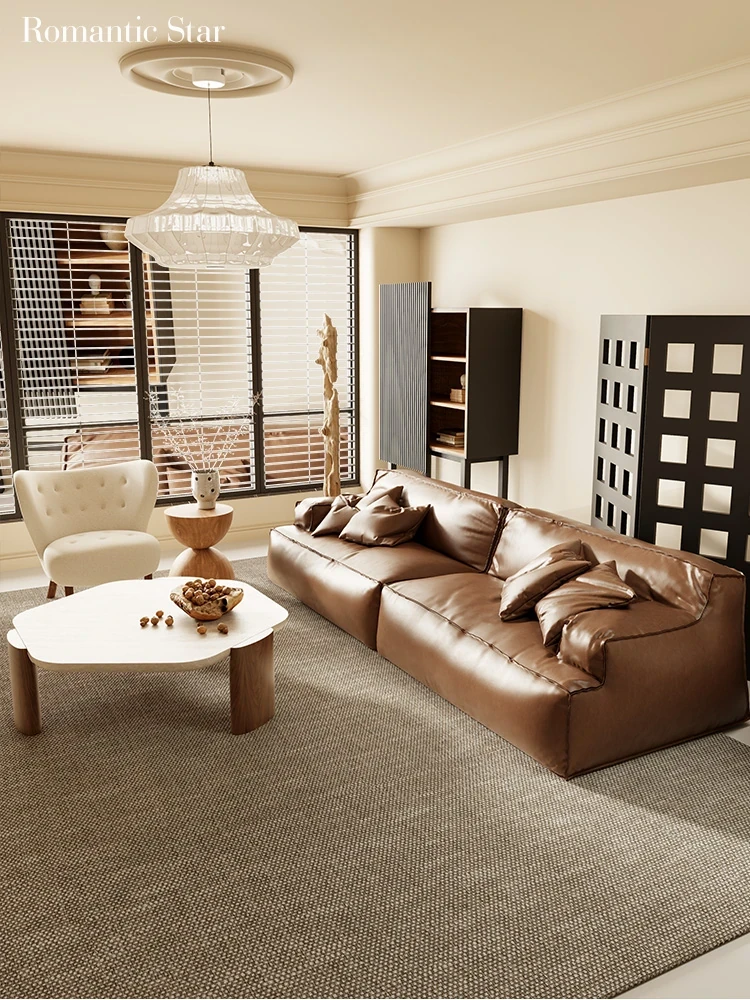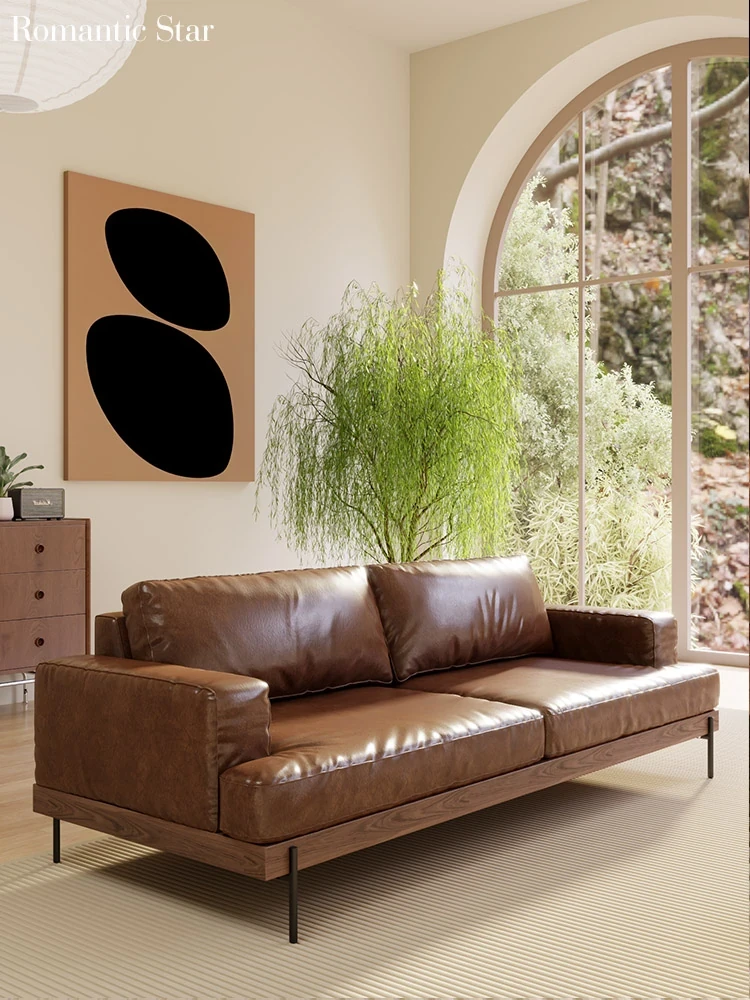 Vintage Genuine Leather Sofa - Minimalist Top-Grain Cowhide, Scandinavian Style for Small Living Rooms, Italian Design, Straight-Line Three-Seater, French Elegance.