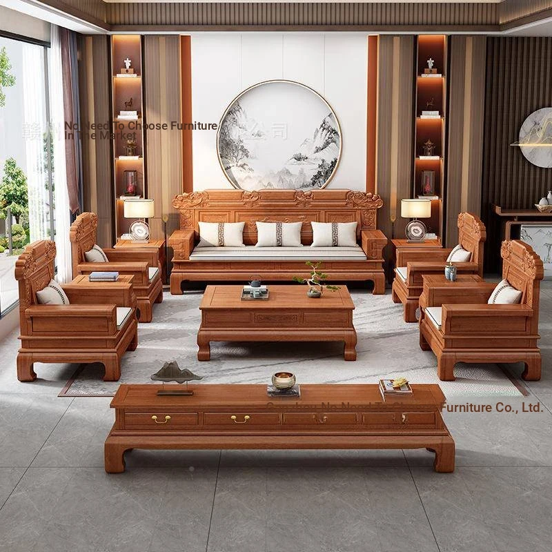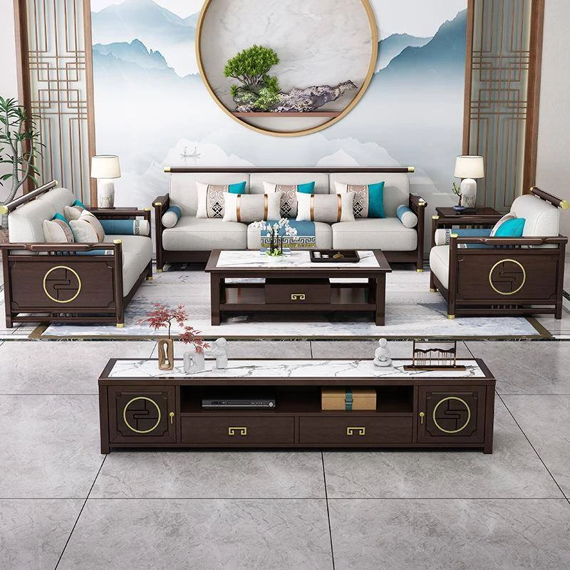 Elegant New Chinese Style Black Gold Wood LJ-JY-W1 Solid Wood Sofa Set with Coffee Table - Perfect for Spacious Living Rooms, Year-Round Comfort, and Chic Chaise Lounge Design