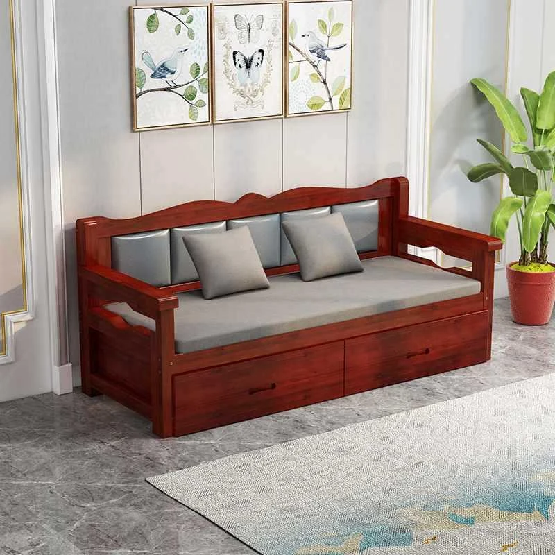 DND Solid Wood Peach Wood Folding Sofa Bed with Drawer Storage - Elegant Carved Design for Living Room and Guest Room Use, Perfect for Space-Saving Solutions