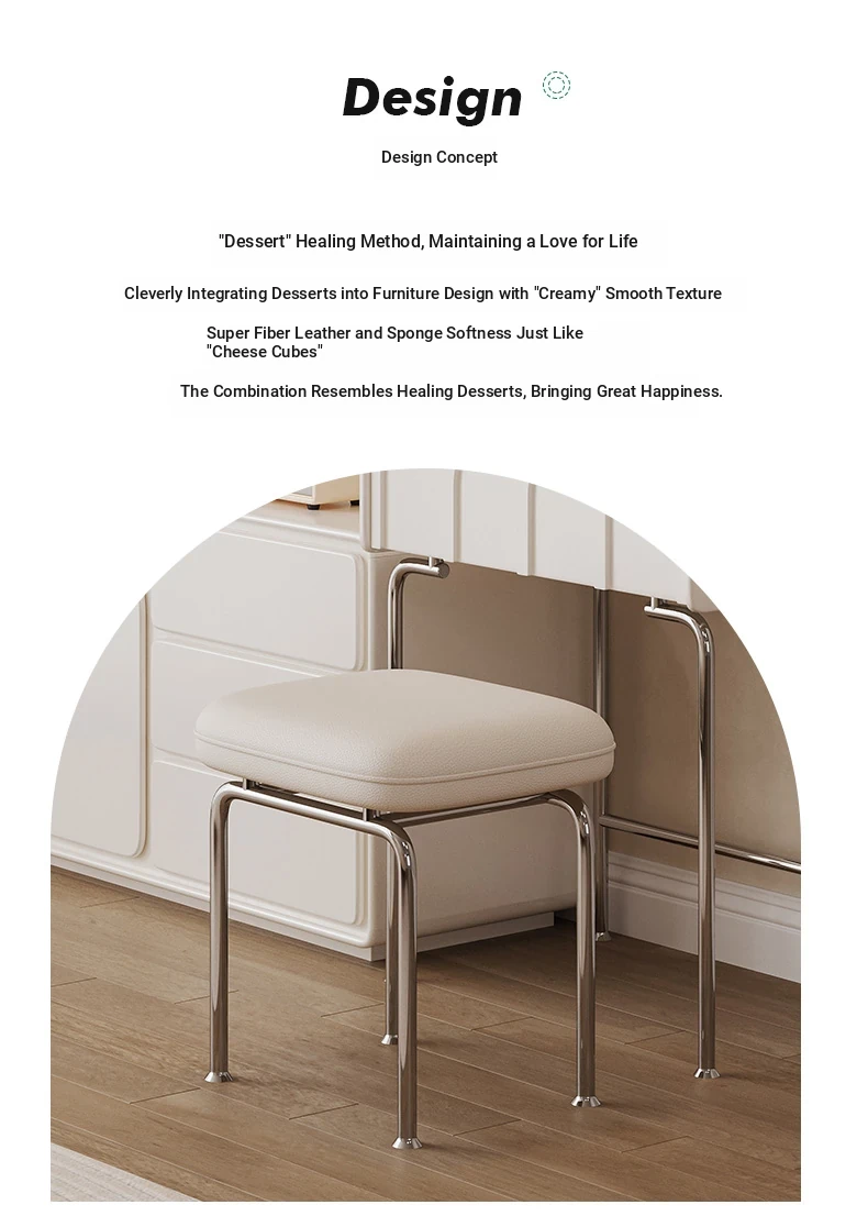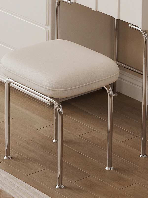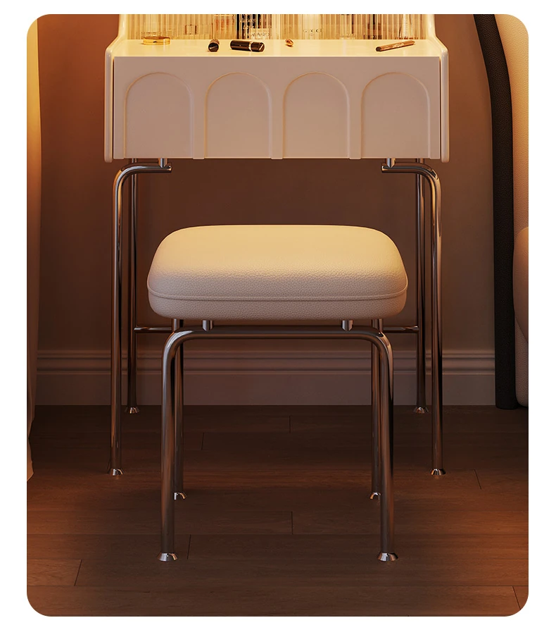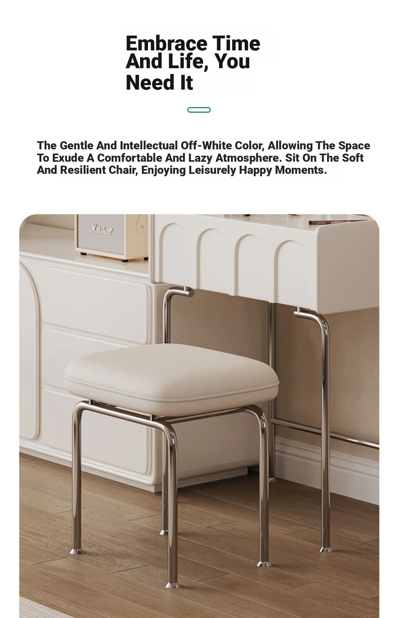 French Cream Vanity Makeup Table with Stool - Luxurious Leather Dressing Chair for Girls' Bedrooms, Elegant Stainless Steel Accent Stool, Perfect for a Chic Makeover Space.
