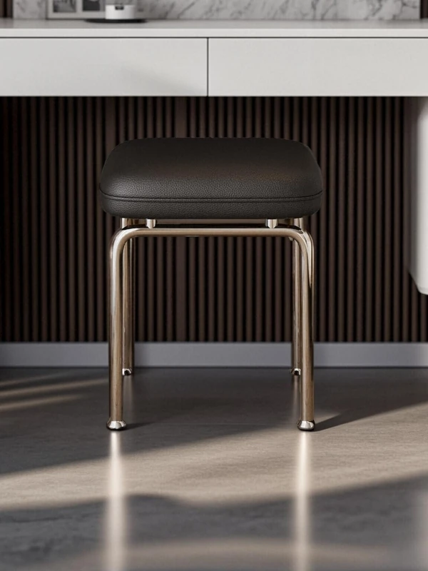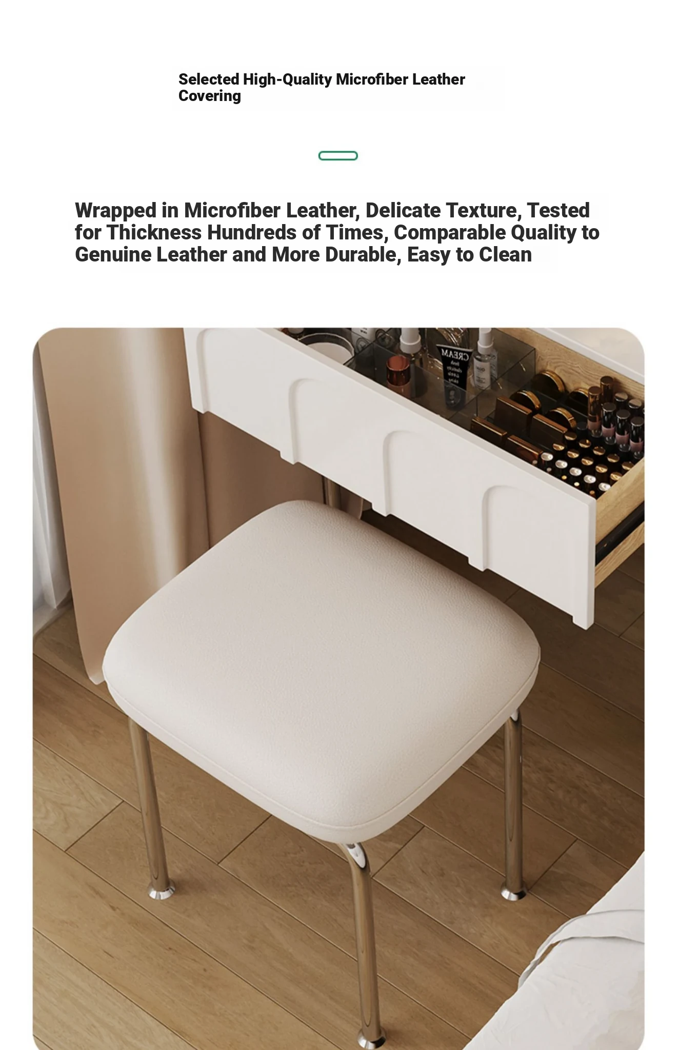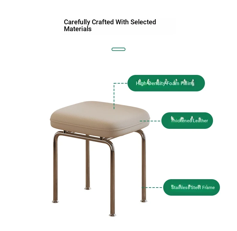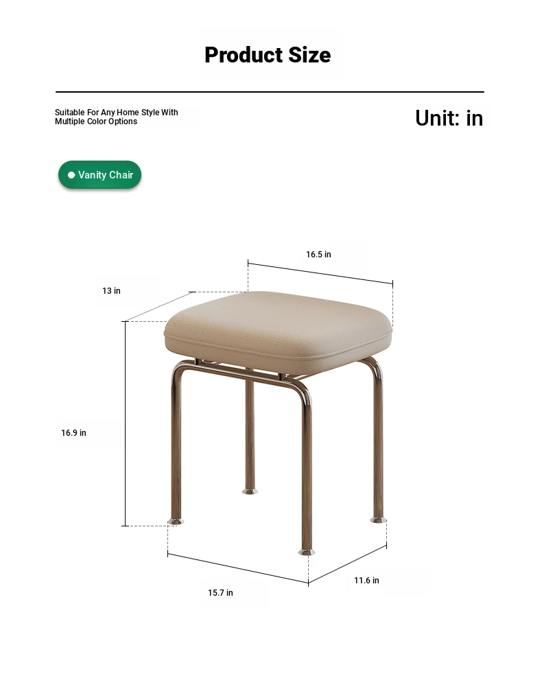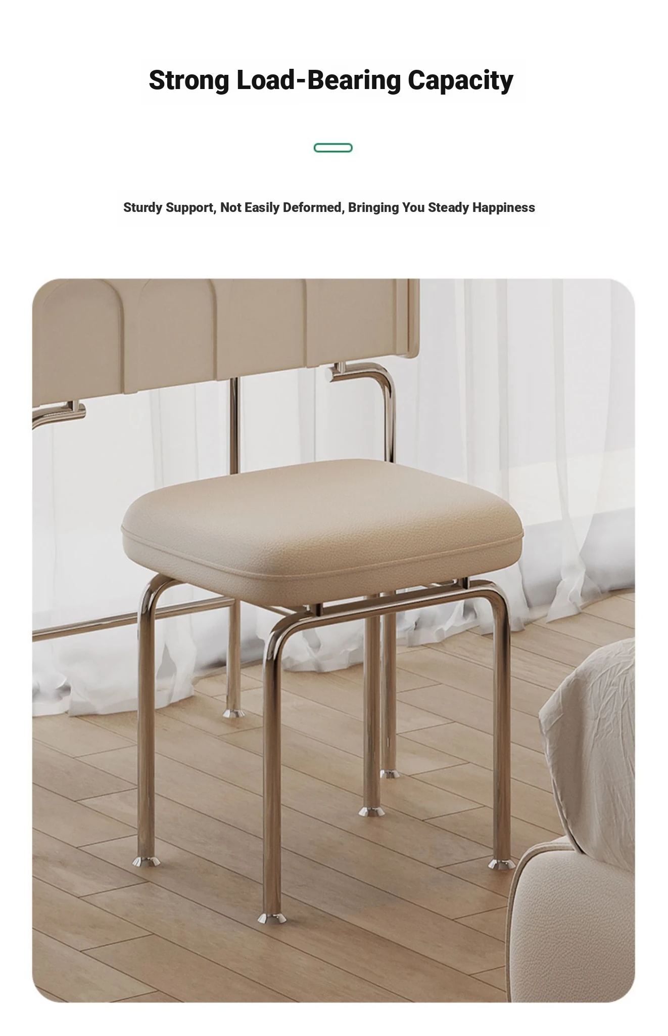 French Cream Vanity Makeup Table with Stool - Luxurious Leather Dressing Chair for Girls' Bedrooms, Elegant Stainless Steel Accent Stool, Perfect for a Chic Makeover Space.