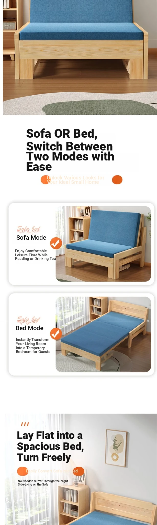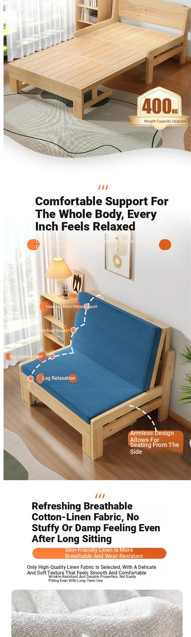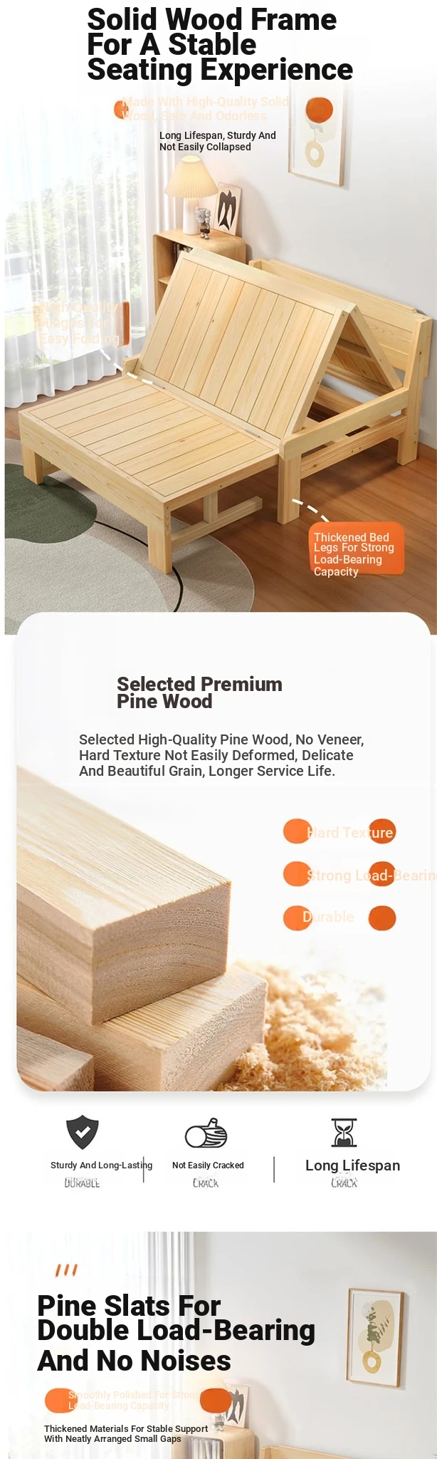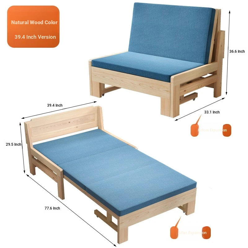 Versatile Solid Wood Sofa Bed - Foldable 2-in-1 Design for Living Room, Study, or Balcony - Perfect for Small Spaces (1.2m, S-Shaped; 1.5m, Double; 1.8m)