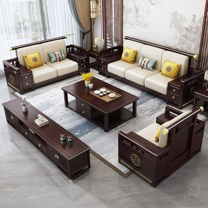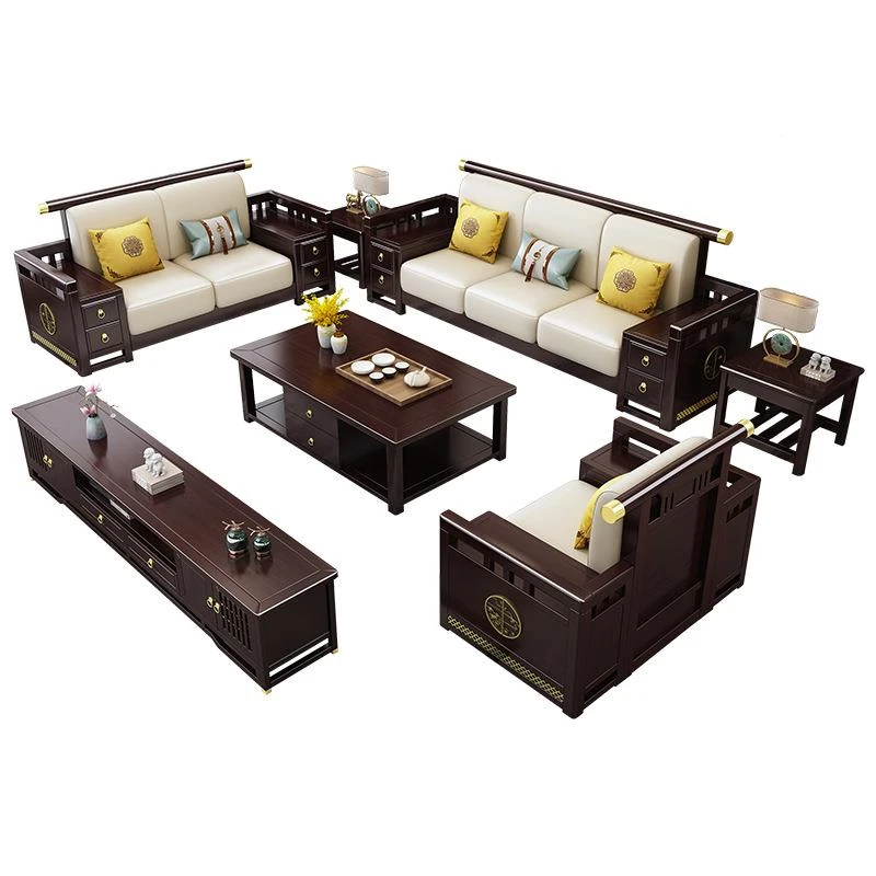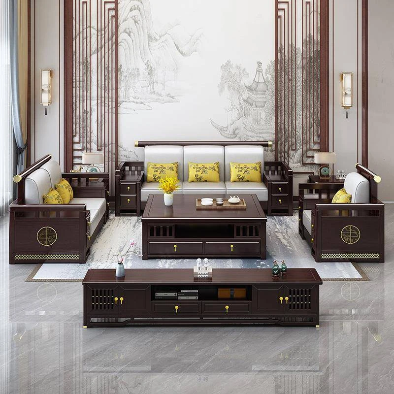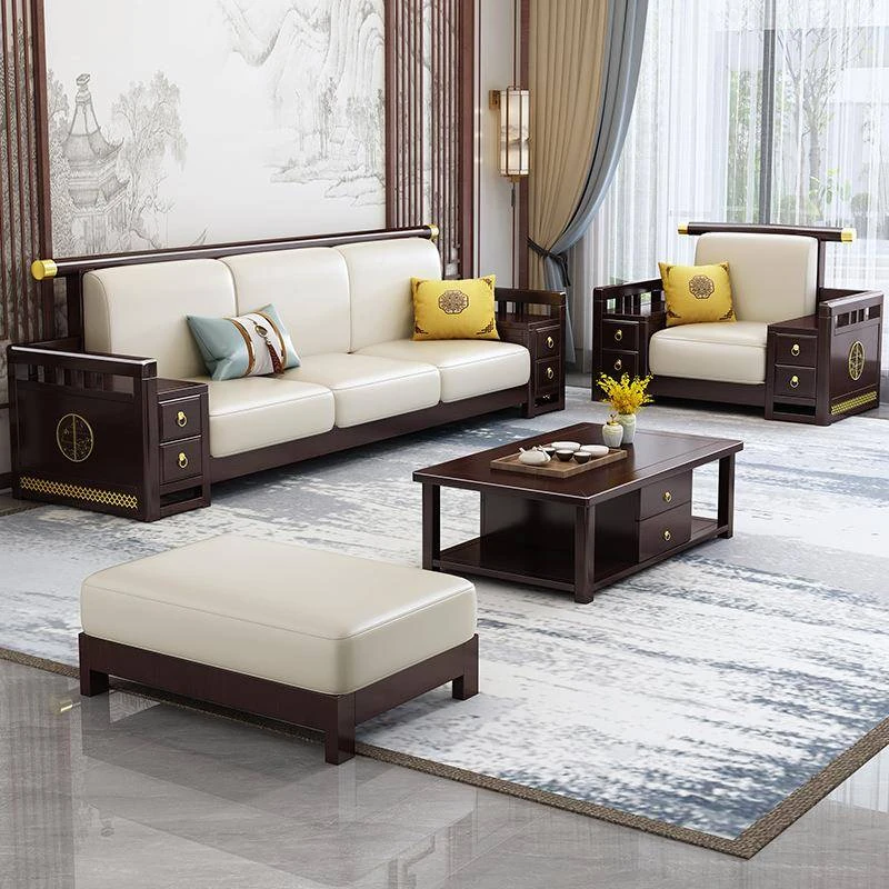 新中MDSF.036型実木ソファー - 家庭用禅スタイルのクラシックな3人掛けコーナーソファ、和の美を感じる木製の贅沢なデザインで、リラックスした空間を演出します。