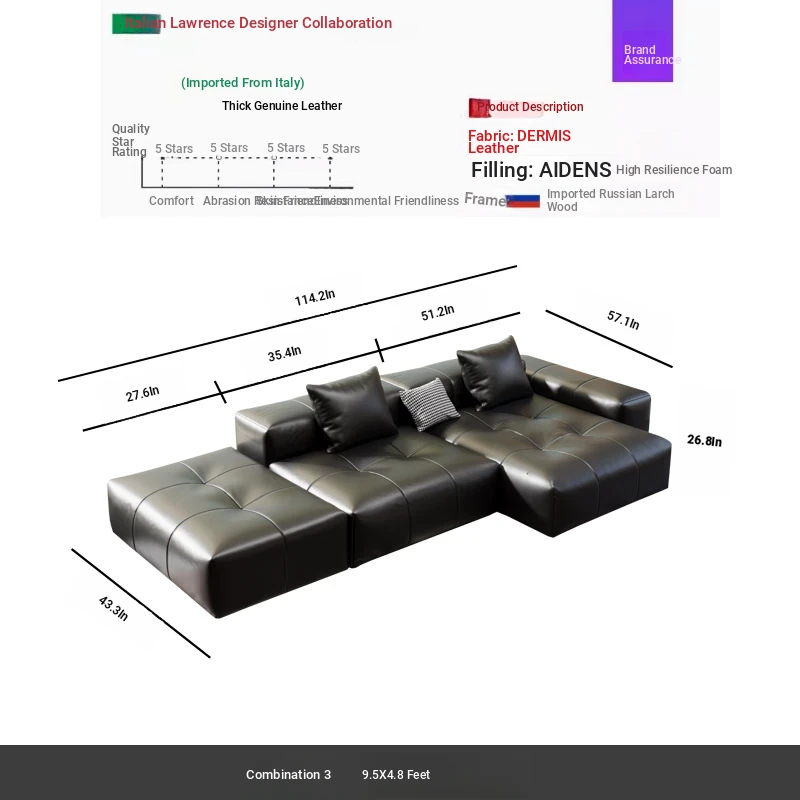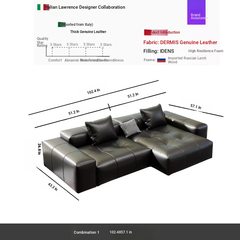 Combination 1 2.6x 57.09 in thickened full leather sofa