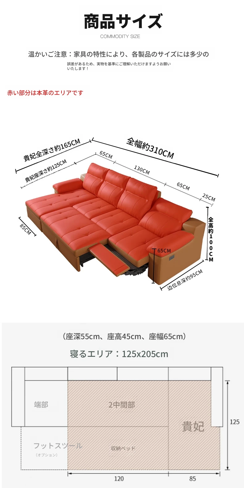 本革ソファ 電動ユニット+トランドルベッド+収納付きカウチ(3.1メートル)