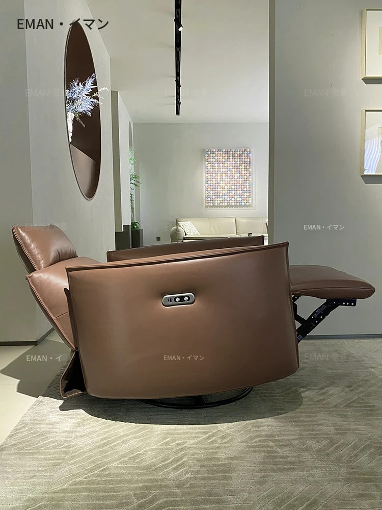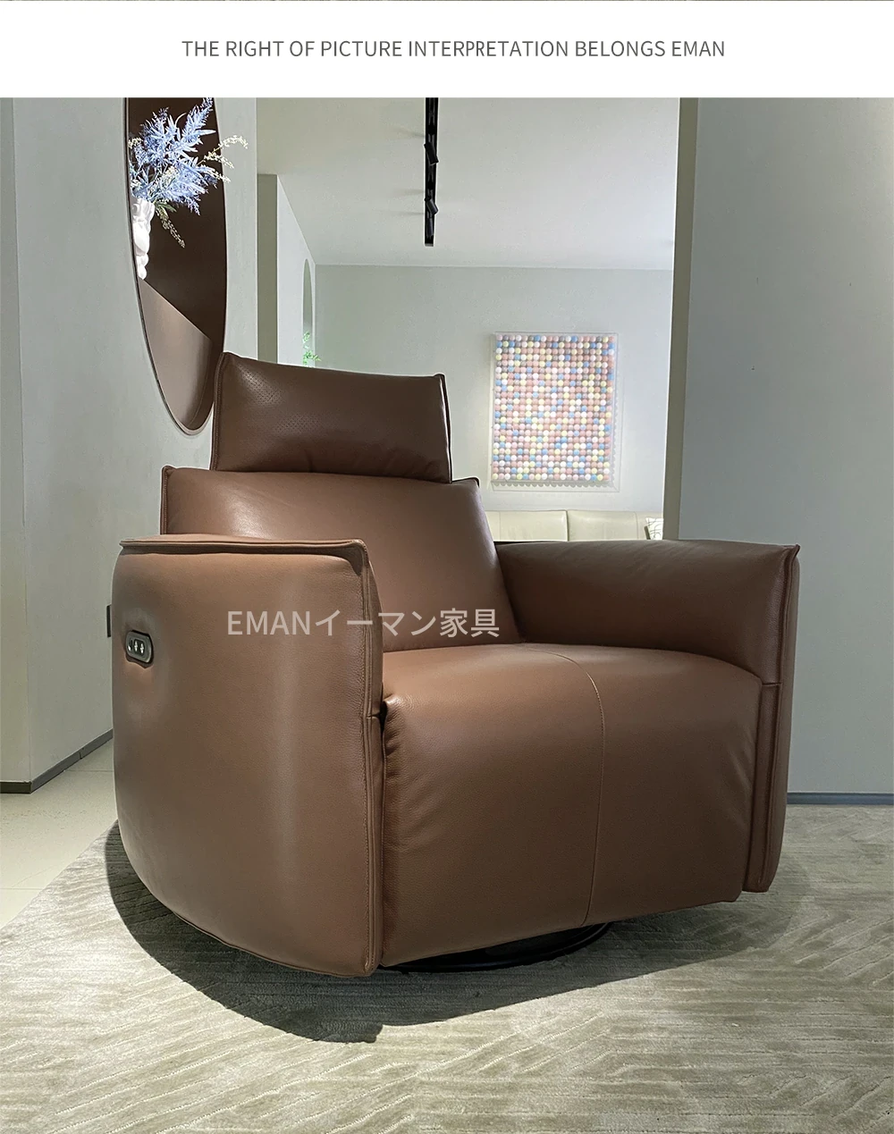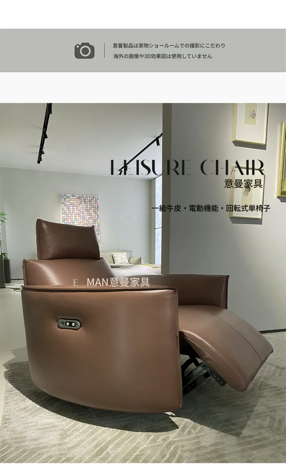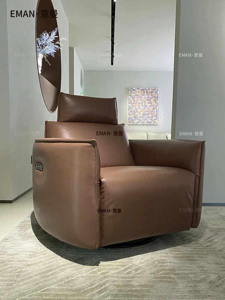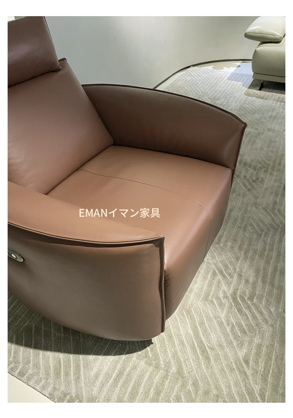 イタリアンミニマルデザインの本革電動リクライニングソファ、一人掛けのモダンな回転リラックスチェア。スタイリッシュなデザイナーアイテムで、快適なひとときを提供します。