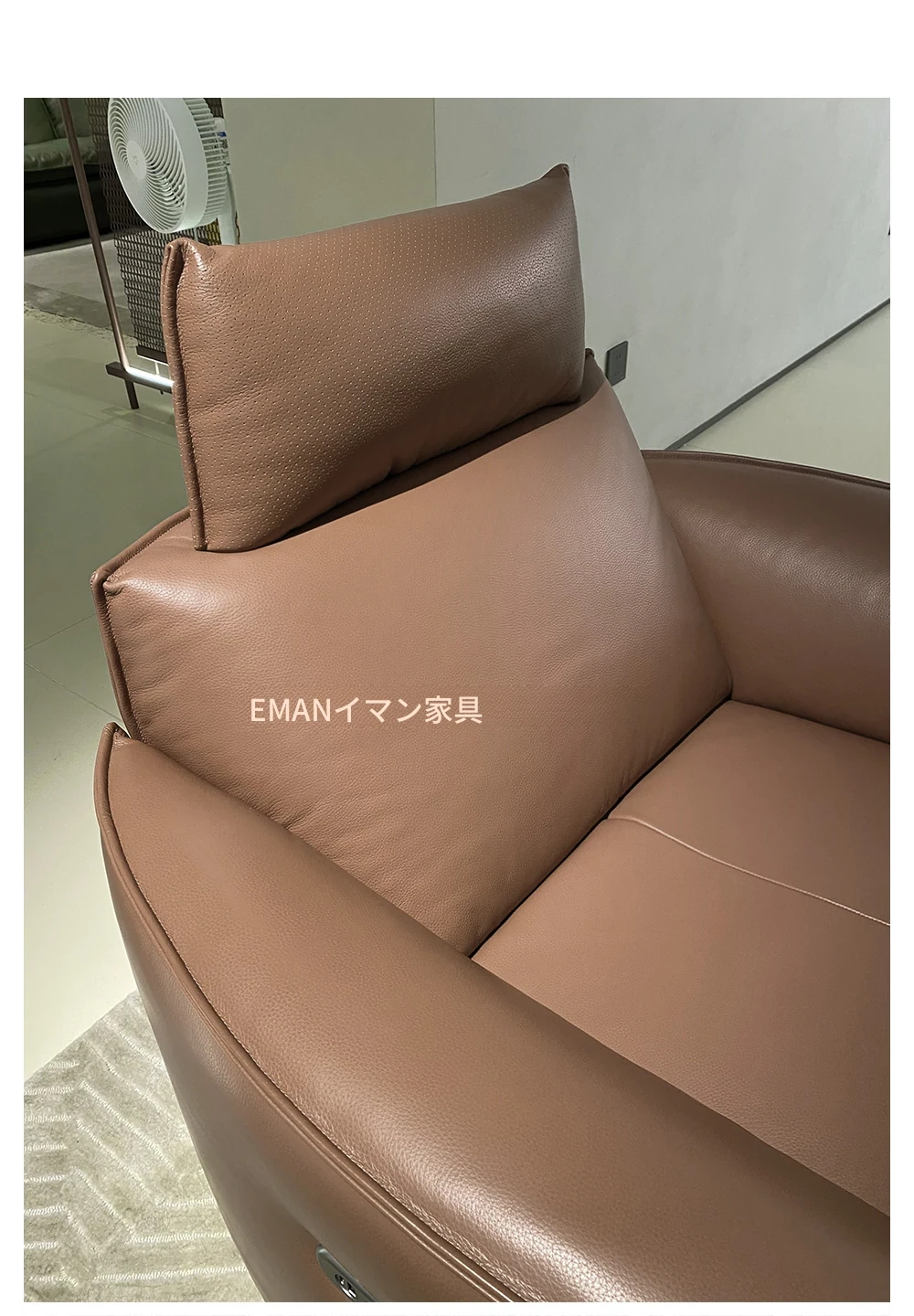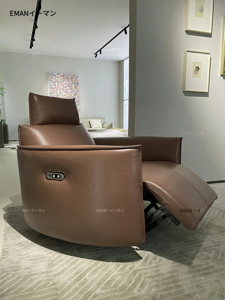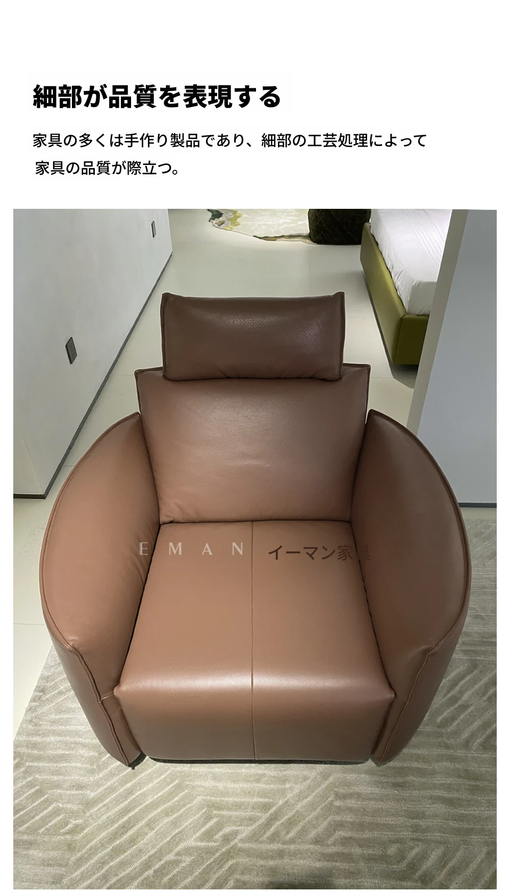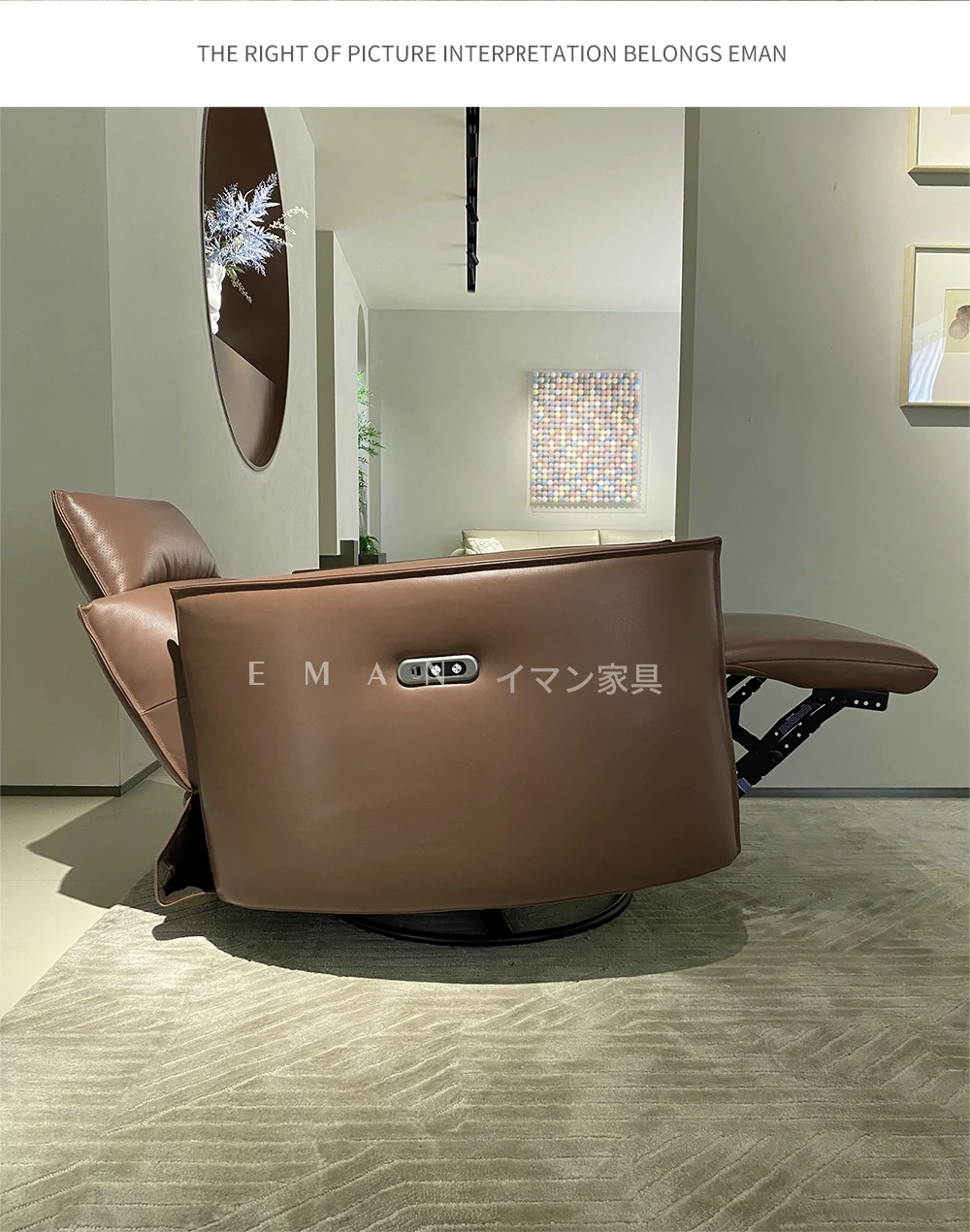 イタリアンミニマルデザインの本革電動リクライニングソファ、一人掛けのモダンな回転リラックスチェア。スタイリッシュなデザイナーアイテムで、快適なひとときを提供します。