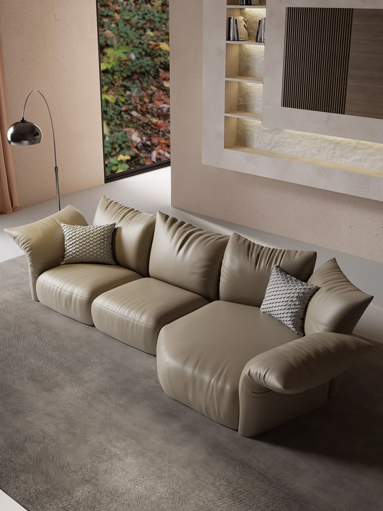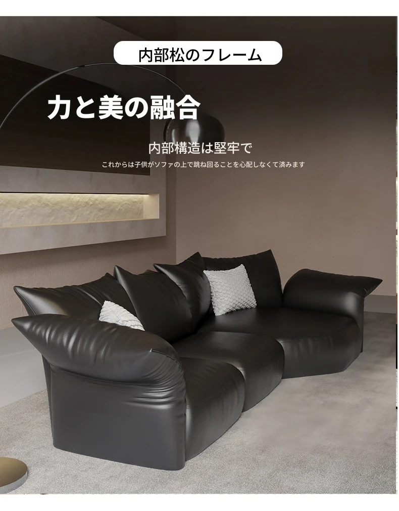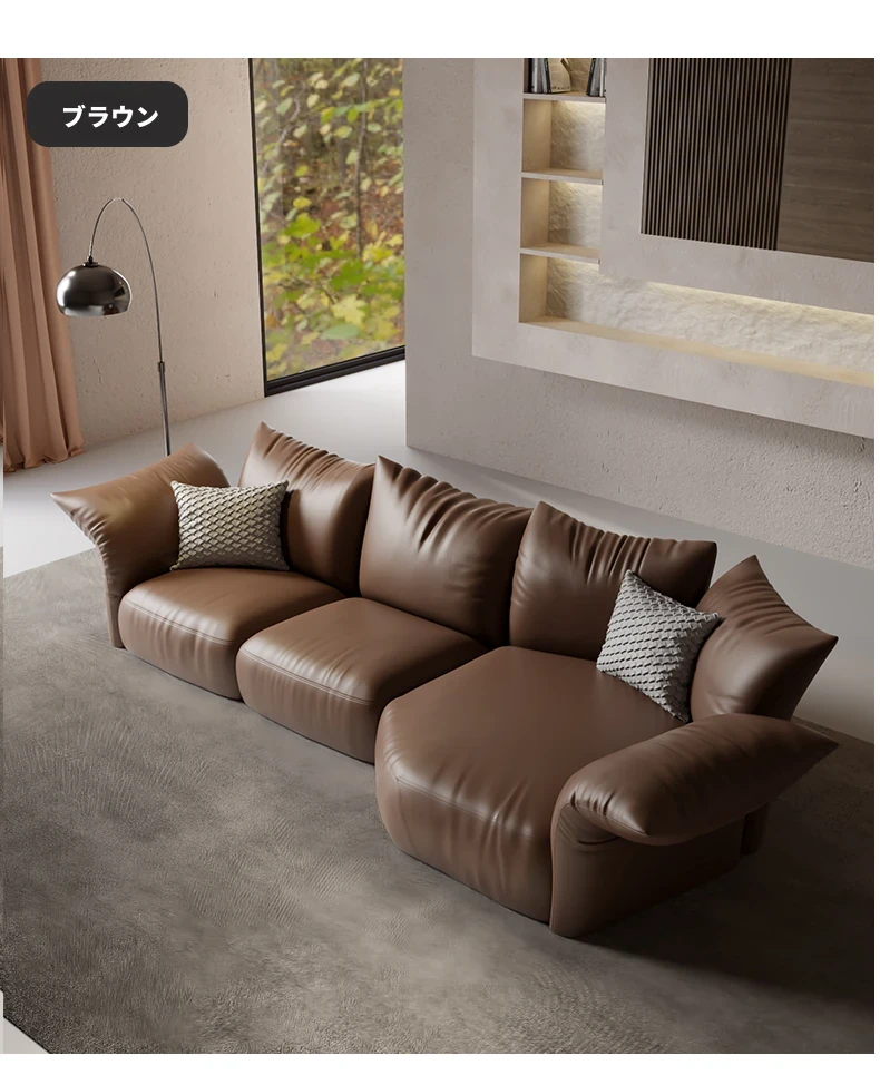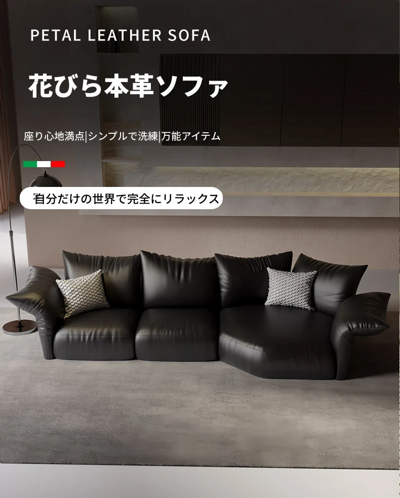 花びらソファ|本革製のユニークデザイン|ラグジュアリーな高級ヴィラリビングに最適|デザイナーによるアーチ型コーナーコンビネーション|機能的でスタイリッシュな直線配置