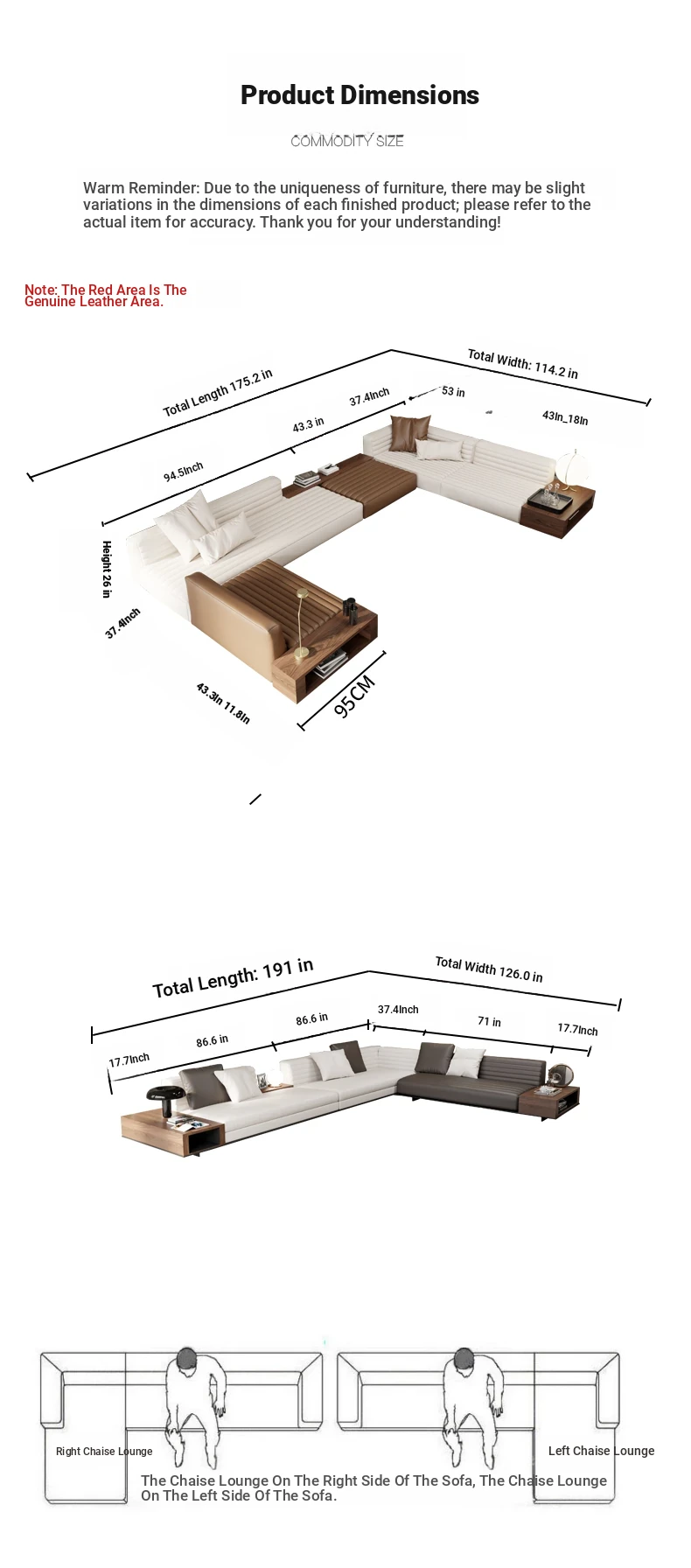 Large U-shaped combination with a total length of 175.20 ins Import leather