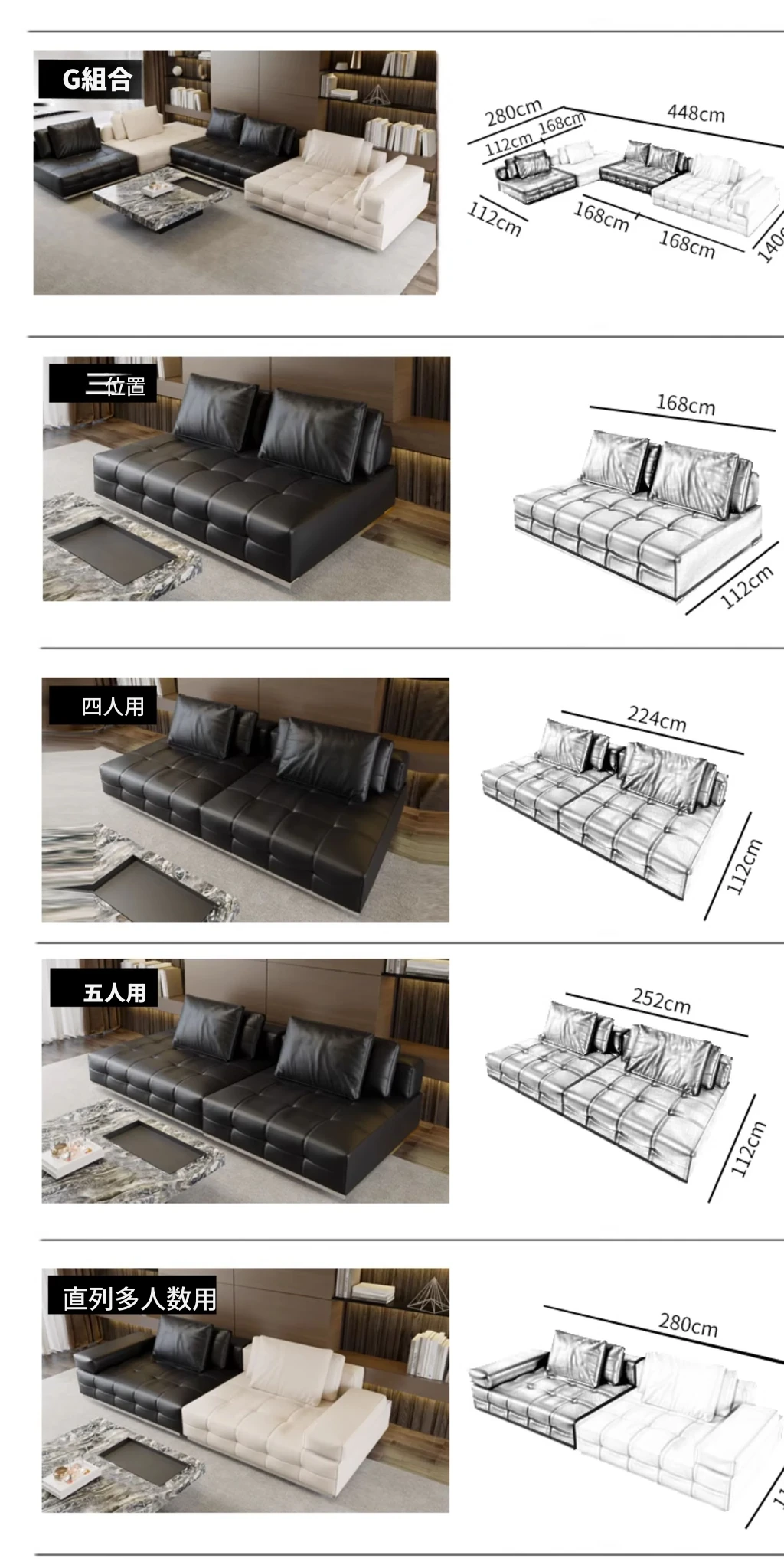 全真皮+非鋼底框 直排多人位2.8メートル長