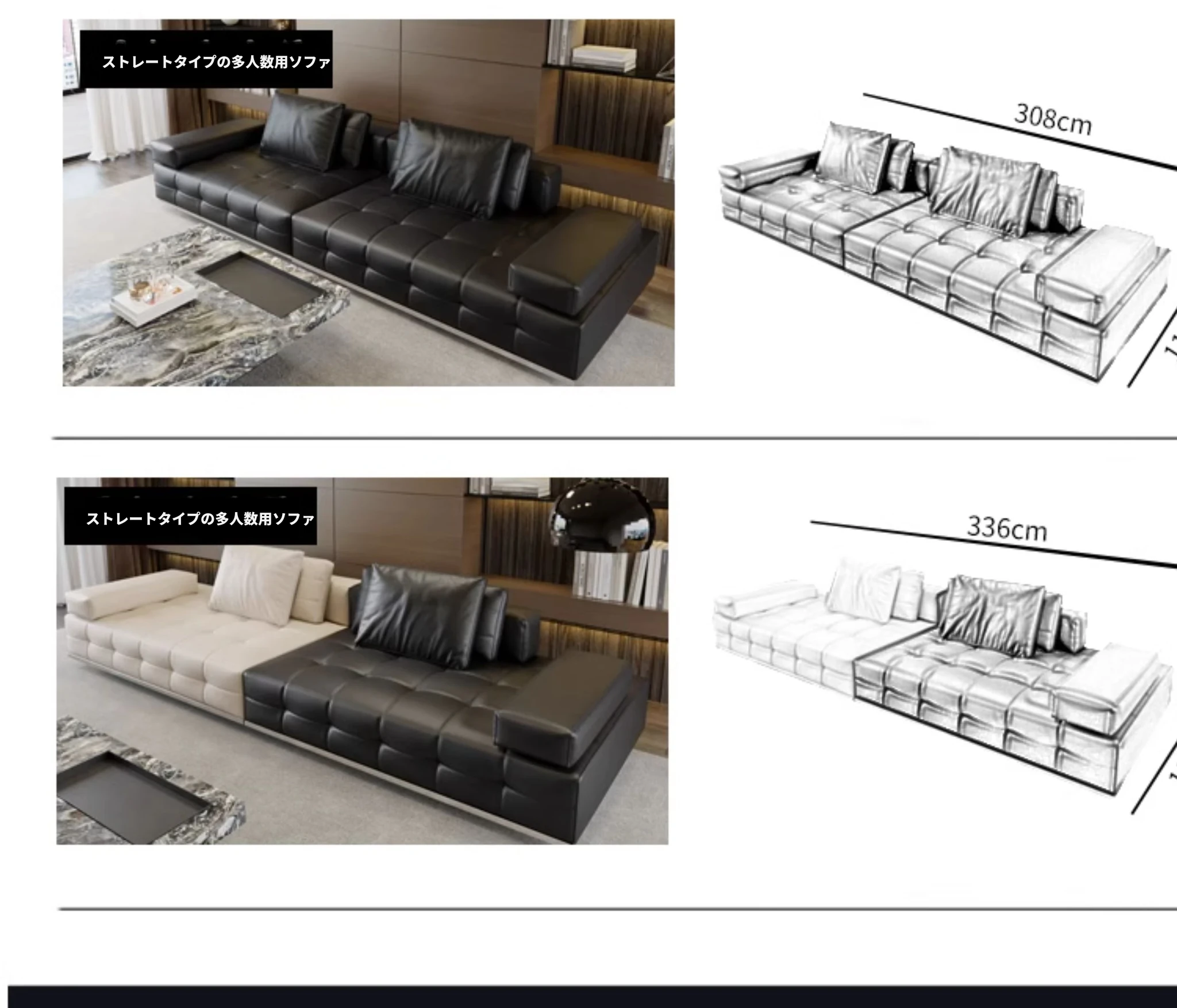 全真皮+非鋼底框 直排多人位3.36メートル長