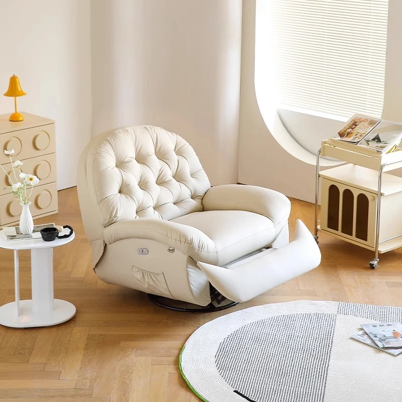 狭いスペースに最適!電動リクライニング単人用プレミアム宇宙型ラウンジソファ。多機能デザインで、リビングやバルコニーにぴったりの本革ロッキングチェアです。快適さとスタイルを兼ね備えた至福のひとときをお楽しみください。